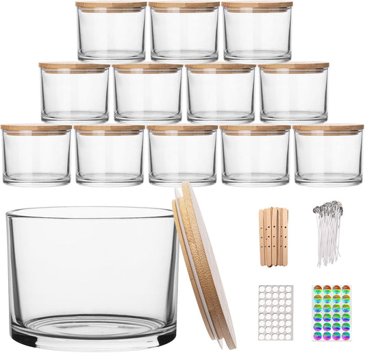 12 Pack 14 oz Clear Glass Candle Jars with Bamboo Lids – Candle Making Kit Includes Wick Holders, Wicks, Labels, and Glue Dots – Reusable and Multipurpose