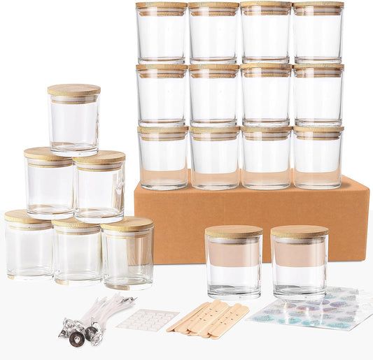 20 Pack 7 oz Clear Glass Candle Jars with Bamboo Lids – Candle Making Kit Includes Wick Holders, Wicks, Labels, and Glue Dots – Reusable and Versatile