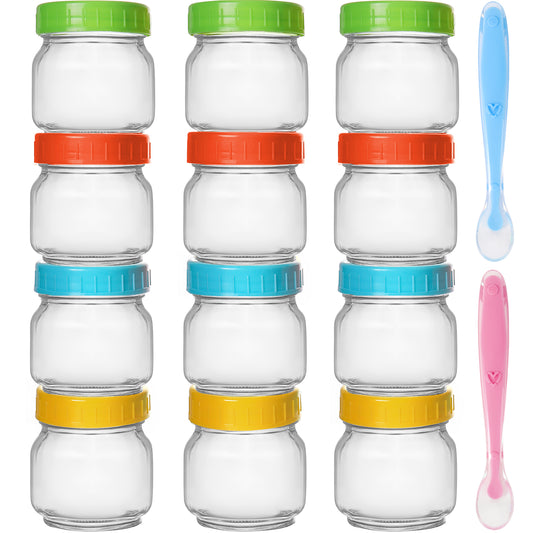 12 Pack 8 oz Premium Glass Baby Food Containers with Airtight Lids - Includes 2 Baby Spoons, Stackable and Microwave Safe