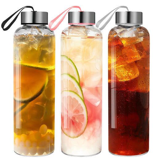 3-Pack 18 oz Glass Water Bottles with Lids – Reusable Juice Bottles, Wide Mouth for Easy Cleaning, Airtight Seals for Freshness, Perfect for Juices, Smoothies, and Refrigeration