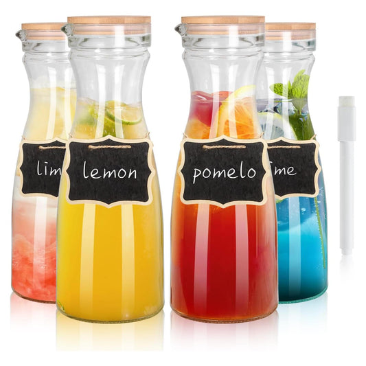 Set of 4 Glass Carafe with 4 Lids, 40 oz Beverage Pitcher Carafe Set for Mimosa Bar, 1 Liter Water Carafe, Juice Carafe for Brunch, Cold Water, Milk, Iced Tea, Lemonade - 4 Wooden Chalkboard Tags