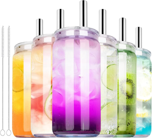 6 Pcs 20 oz Can-Shaped Drinking Glasses with Multicolor Acrylic Lids, Stainless Straws - Ideal for Iced Coffee, Cocktails, Beer, and More