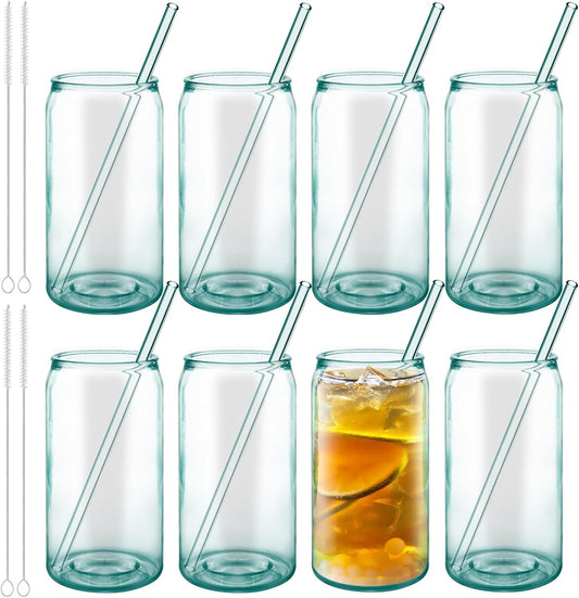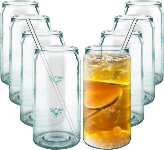 18 oz Can Shaped Drinking Glasses - 8 Pack with Reusable Straws, Recycled Glass Tumblers with Embossed Bee, Ideal for Beer, Iced Coffee, Water, and Fresh Drinks