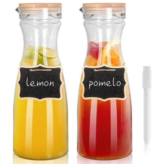 Set of 2 Glass Carafe with 2 Lids, 40 oz Beverage Pitcher Carafe Set for Mimosa Bar, 1 Liter Water Carafe, Juice Carafe for Brunch, Cold Water, Milk, Iced Tea, Lemonade - 2 Wooden Chalkboard Tags