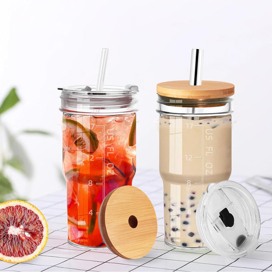 2-Pack Glass Cups with Lids and Straws, 20oz Wide Mouth Drinking Jars for Bubble Tea, Iced Coffee, Smoothies, and More - Reusable Tumbler with Bamboo Lids, Perfect Gift Set